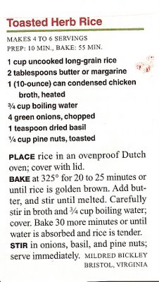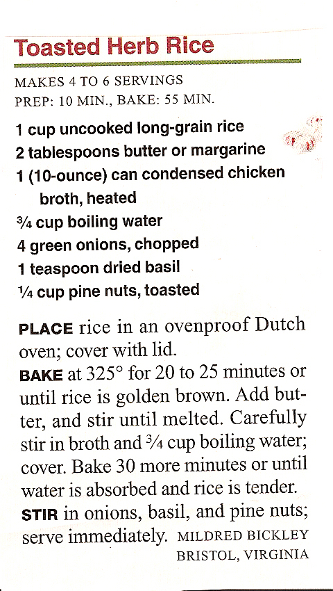 Sadly though, this recipe comes from and old 1995 or ’96 issue of Southern Living that I have moved 3 times and finally disposed of after removing any helpful information. This issue and many others were finally harvested a few weeks ago. This recipe is wonderful and wonderfully easy. You can make so many versions by changing one thing or another, but the basic recipe is GREAT. Try it. The rice doesn’t even stick to the pan!!