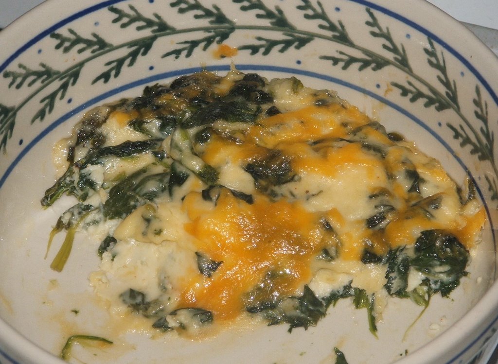 I started with a large bag of fresh spinach. This really cooks down, so it’s hard to get too much. Instead of boiling or steaming the spinach, I sauted it in a couple tablespoons of Olive Oil and a dash of salt. It only took a couple of minutes. While the spinach is cooking, take 2 Tbsp of corn starch and dissolve it in about a cup of half-n-half. Then place cream mixture in a pan over low heat. As the mixture heats, it will thicken rapidly. When thickened, quickly add 1/4 cup shredded cheddar and a 1/2 cup parmesean cheese. Toss cooked spinach in the cheese sauce and place in a casserole dish. Top with a little extra shredded cheese and place in the oven at 350 degrees for about 20 minutes or so. Yum!!