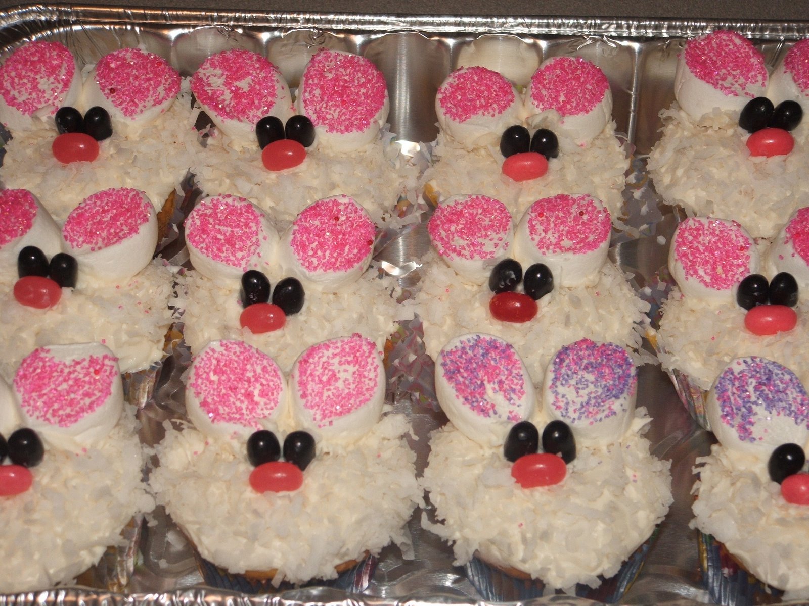 After the cupcakes have cooled, ice them with a white icing and then dip the tops in coconut. Use icing to help the marshmallows and jellybeans stay in place on the face. You can use decorating gel to make whiskers if you want to add them. Have fun!